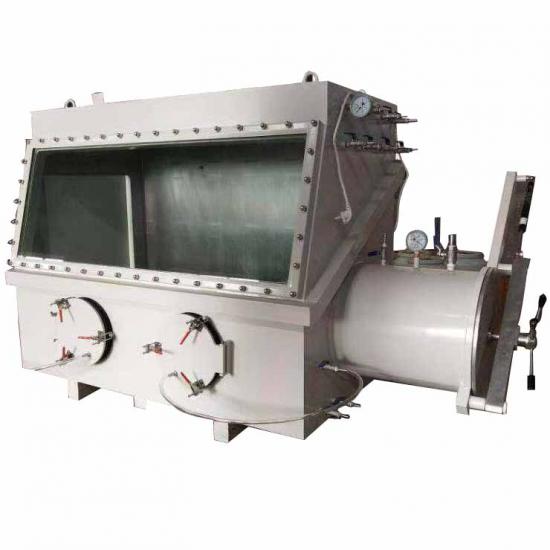 It is mainly composed of main box, transit room and base. If user has special requirement, it can also be customized and designed according to customer needs.There are 2 or 3 glove interfaces. In front of the main box, user can clearly view the inner situation. There is one vacuum ball valve above the main box body. It can be used according to user needs. The ball valve can be connected with water faucet when needing water or ventilation. Light bulb can be also installed. Transit room means the transition between the main box and outdoor, composed by two sealed doors, two vacuum ball valves and one room. Two doors isolate main box from connecting with the outdoor, making material putting in and taking out for lab easily.