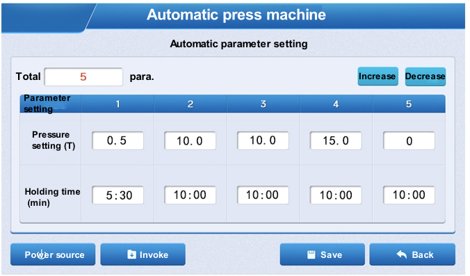 Invoke button: Invoke the set parameters to the automatic operation interface for pressure.