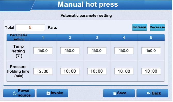Invoke button: Invoke the set parameters to the automatic operation interface for pressure.