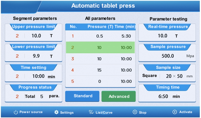 Standard interface: Various parameters such as pressure, demoulding, time, sample size, etc. can be set in this interface alone.