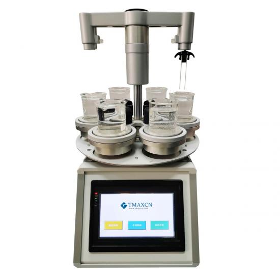 The TMAX-KJ06H six-station dip coater processes one sample at a time through programmable counterclockwise rotation. Samples are immersed in material-loaded beakers for preset durations before being lifted for drying, with both immersion and drying times being fully adjustable.